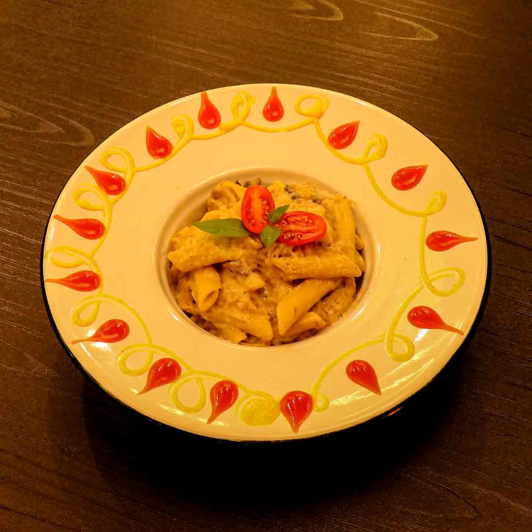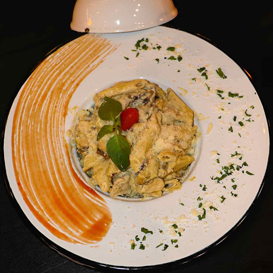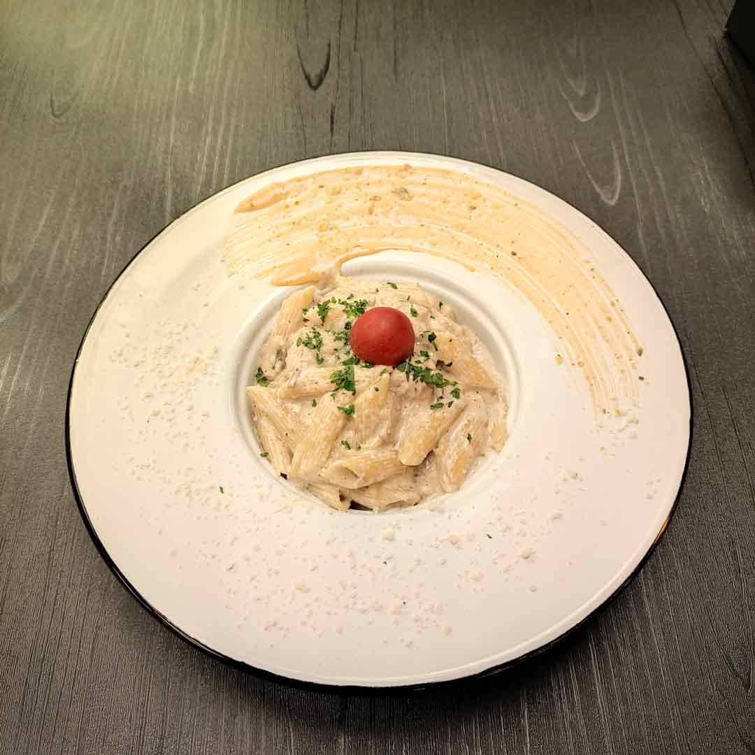 150 گرم فیله مرغ _قارچ _خامه _پنه _شیر_پنیر پارمسان _ سس پنیر دیپ _سیر _سس آلفردو