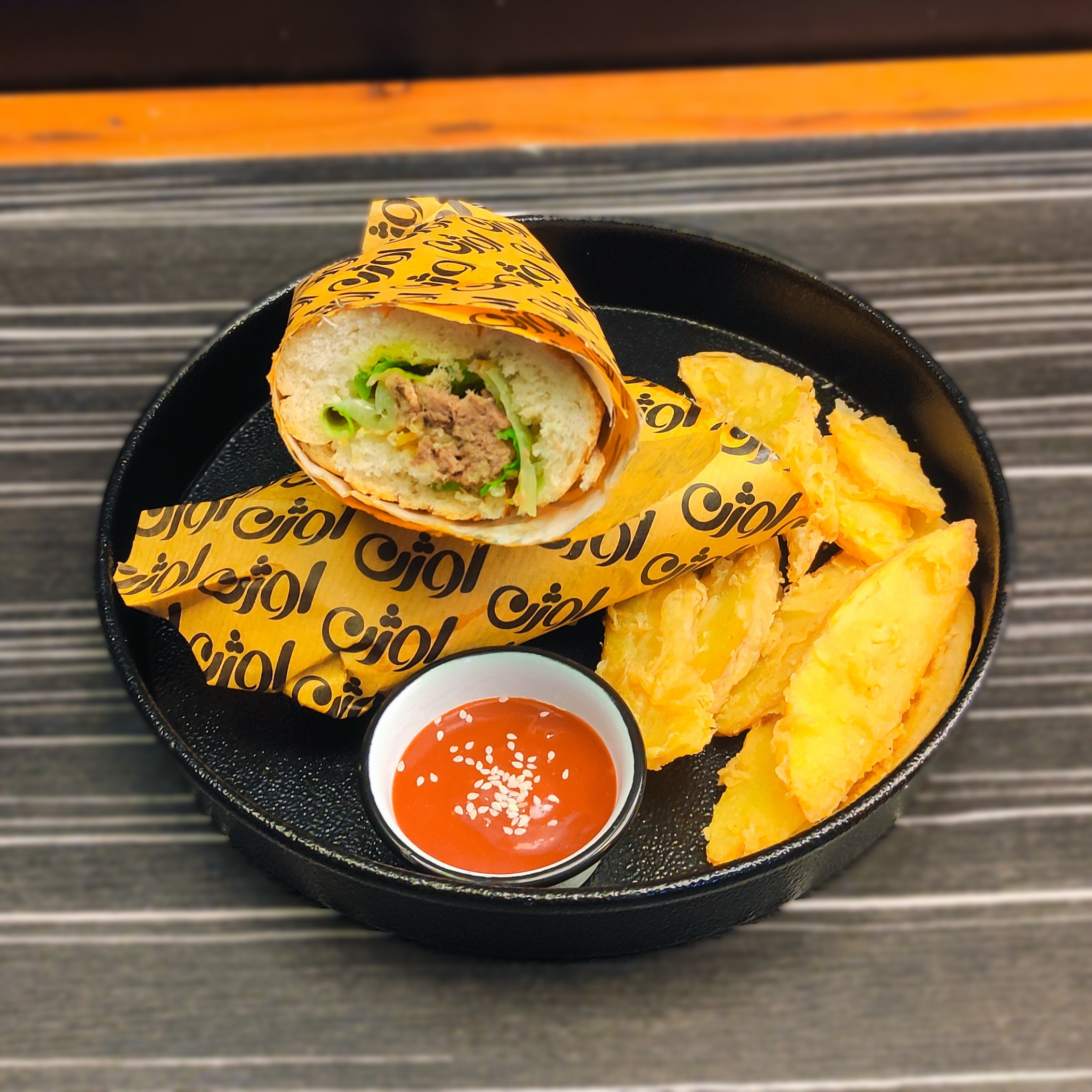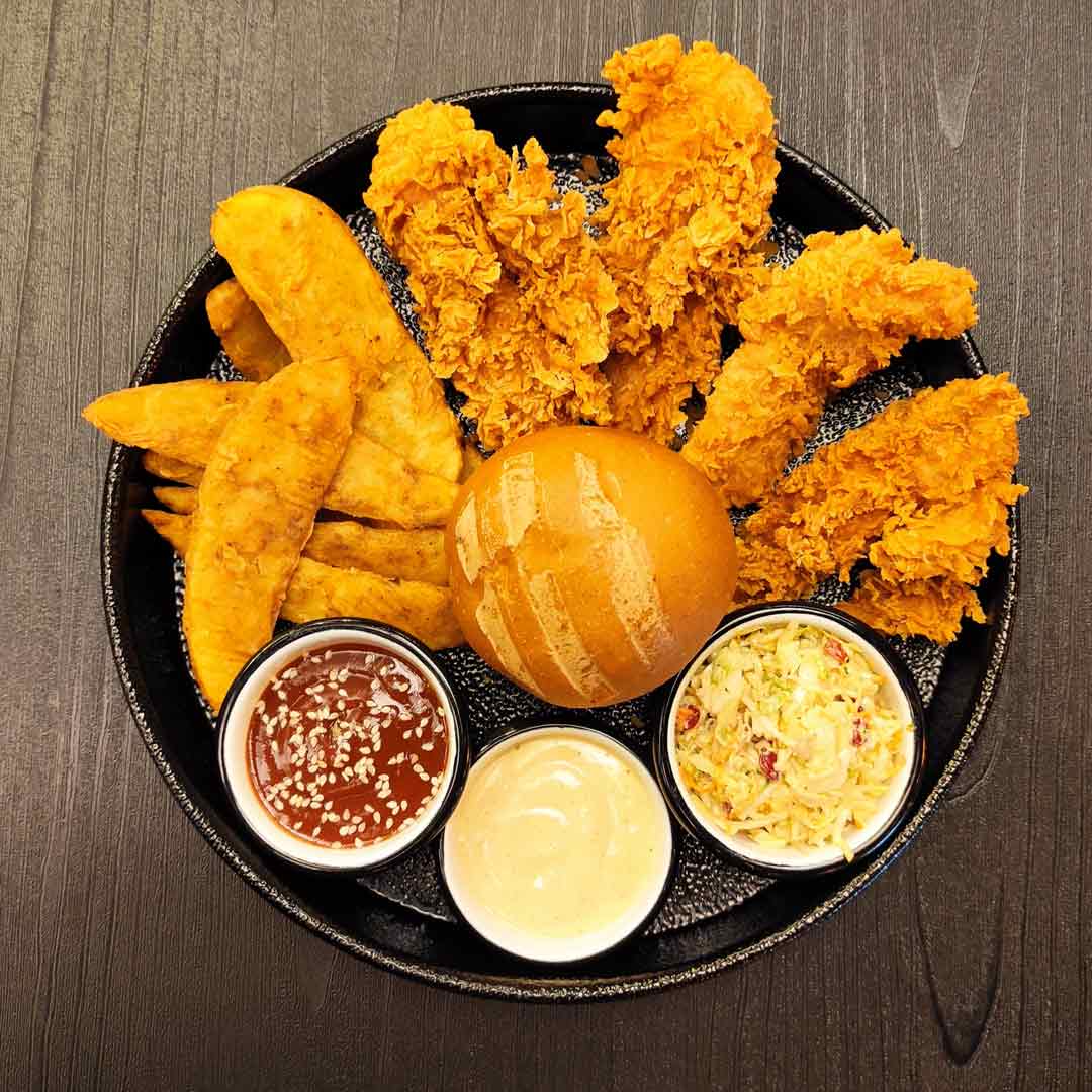 4تیکه مرغ اسپایسی _سیبزمینی سوخاری _سالاد کلم _سس سیر_نان بروچن