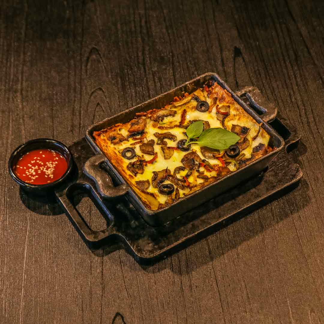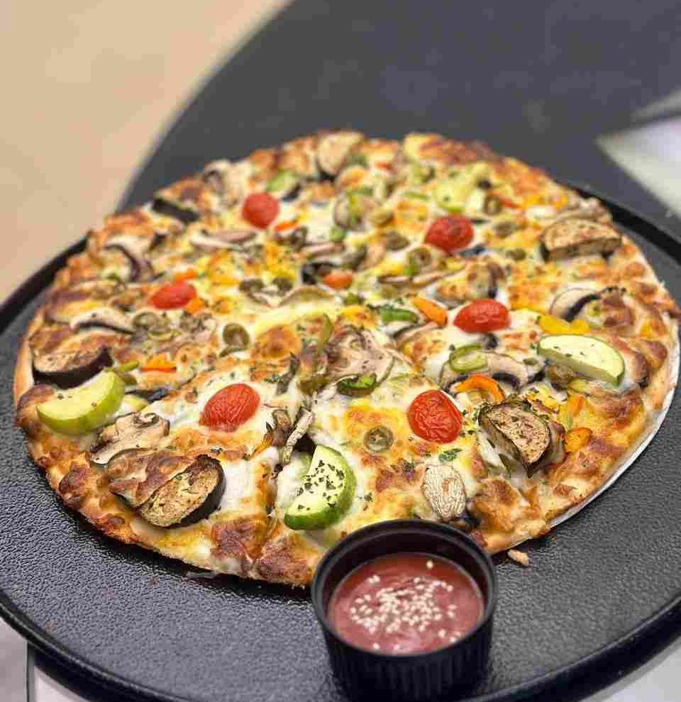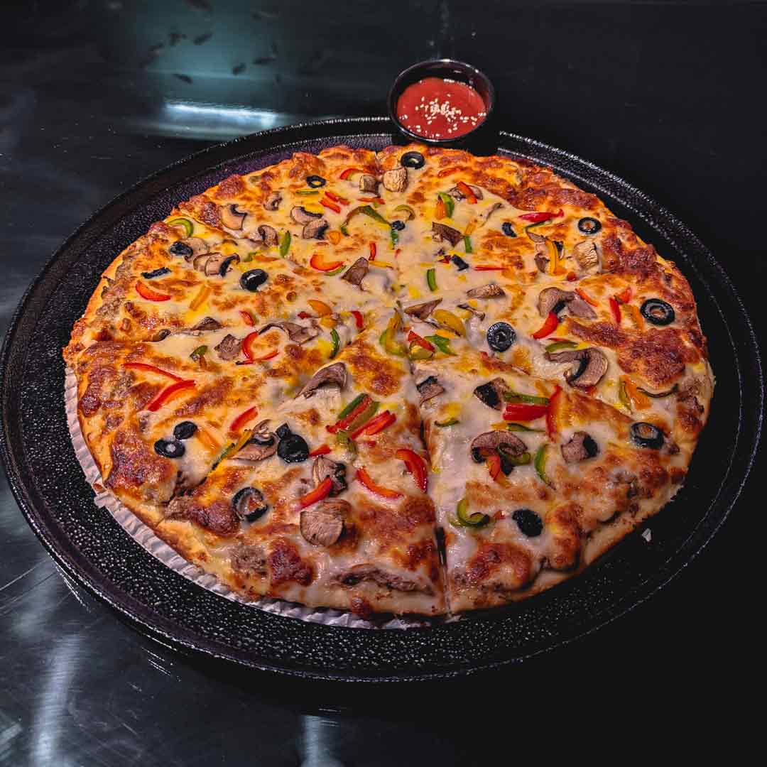 120 گرم گوشت چرخ کرده_فلفل دلمه رنگی _ قارچ_ پنیر موزارلا _سس بشامل