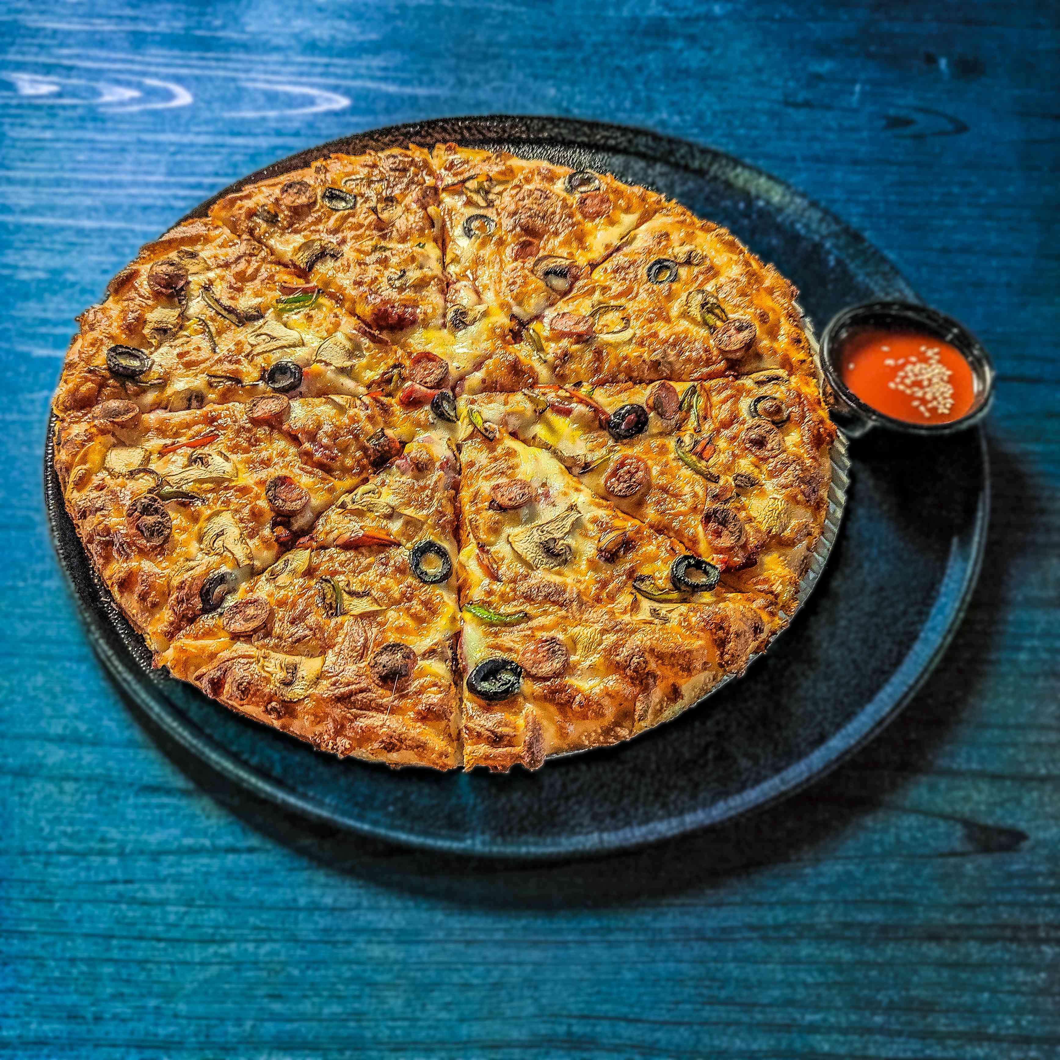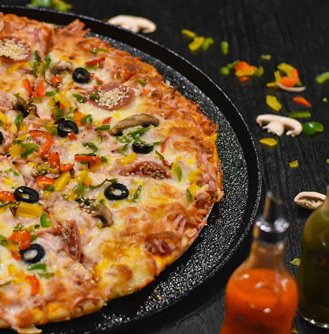 خمیر ایتالیایی _سس ناپولتین_ سالامی98%_ چوریتسو_پنیر موزارلا _فلفل دلمه رنگی _زیتون سیاه _قارچ