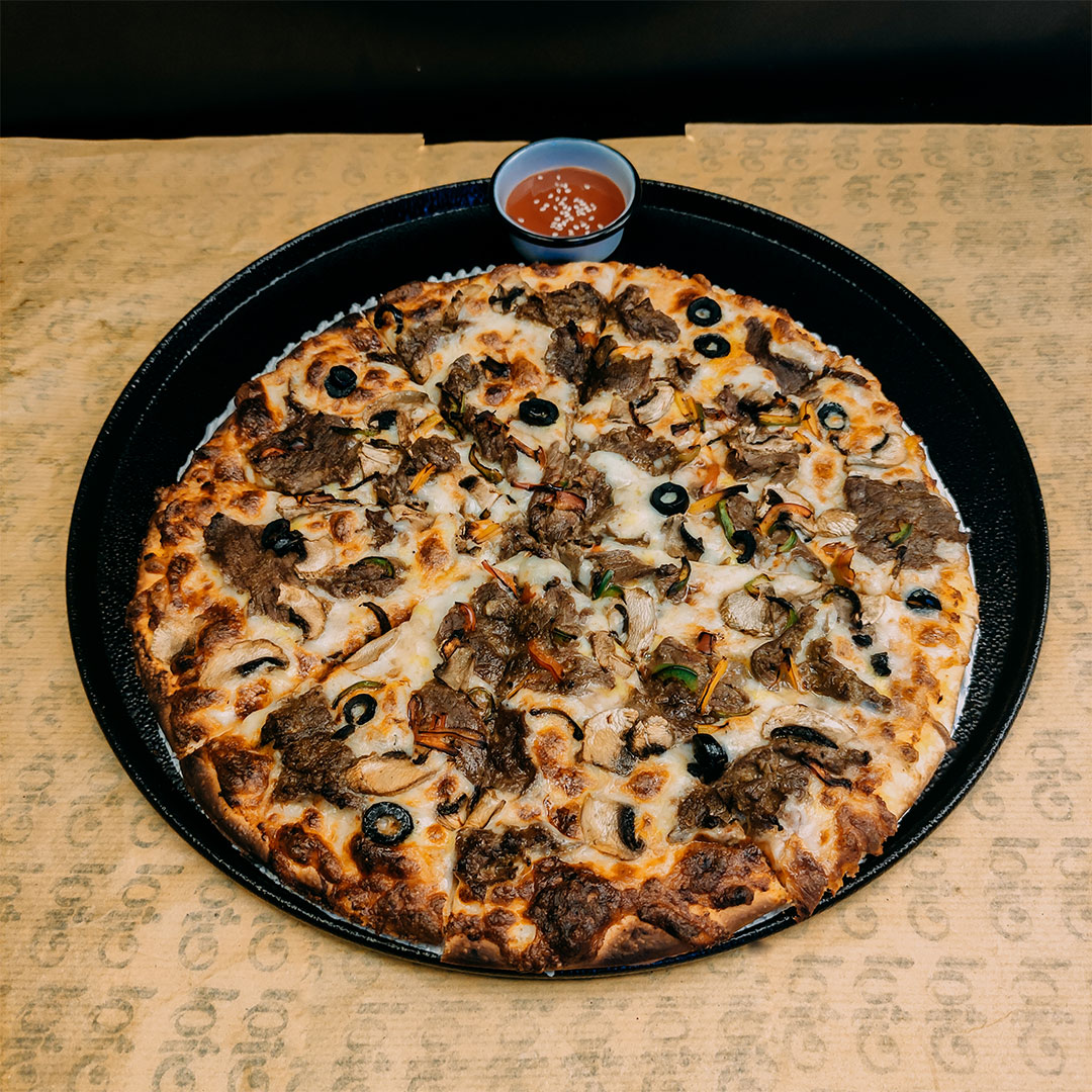 خمیر ایتالیایی _سس سیر _گوشت گوساله اسلایس طعم دار شده _قارچ _زیتون سیاه _ پنیر موزارلا