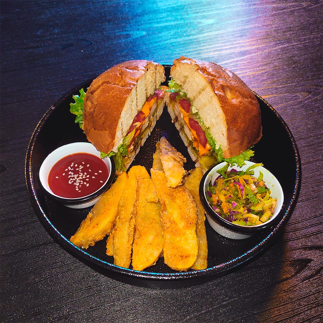 170 گرم سینه مرغ طعمدار شده _پنیر چدار _کاهو باتاویا _گوجهفرنگی _خیارشور _سس رنج _سس سیگنیچر