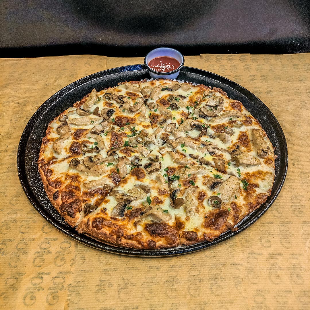 خمیر ایتالیایی_سس آلفردو _فیله مرغ طعمدار شده _قارچ _زیتون سبز _پنیر پارمسان _پنیر موزارلا