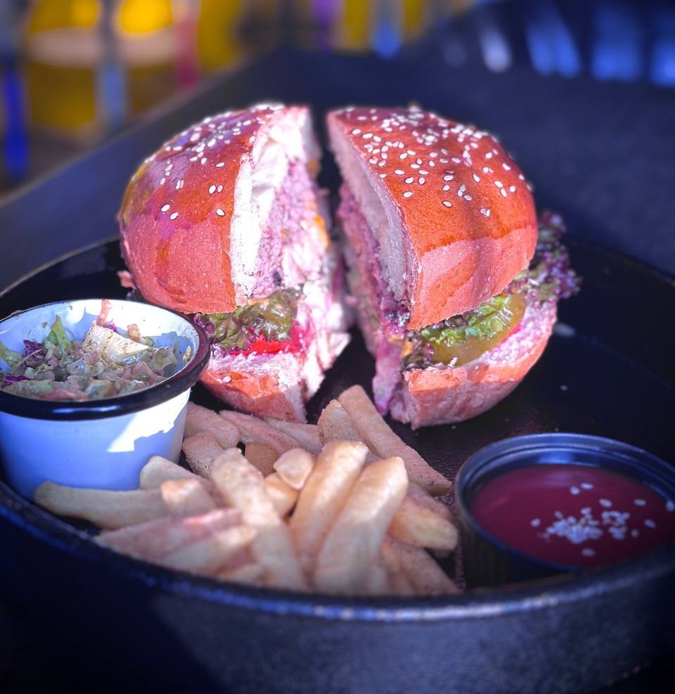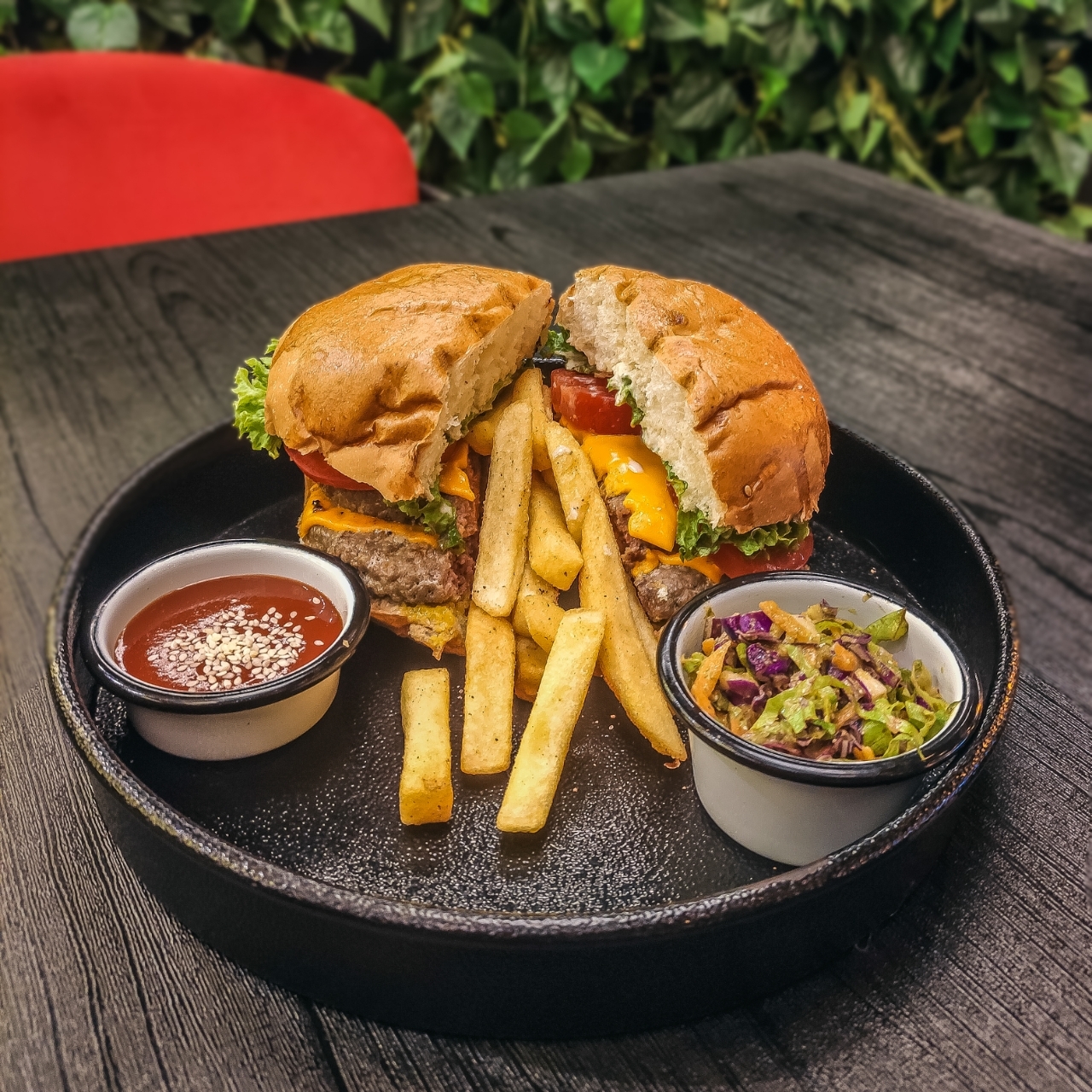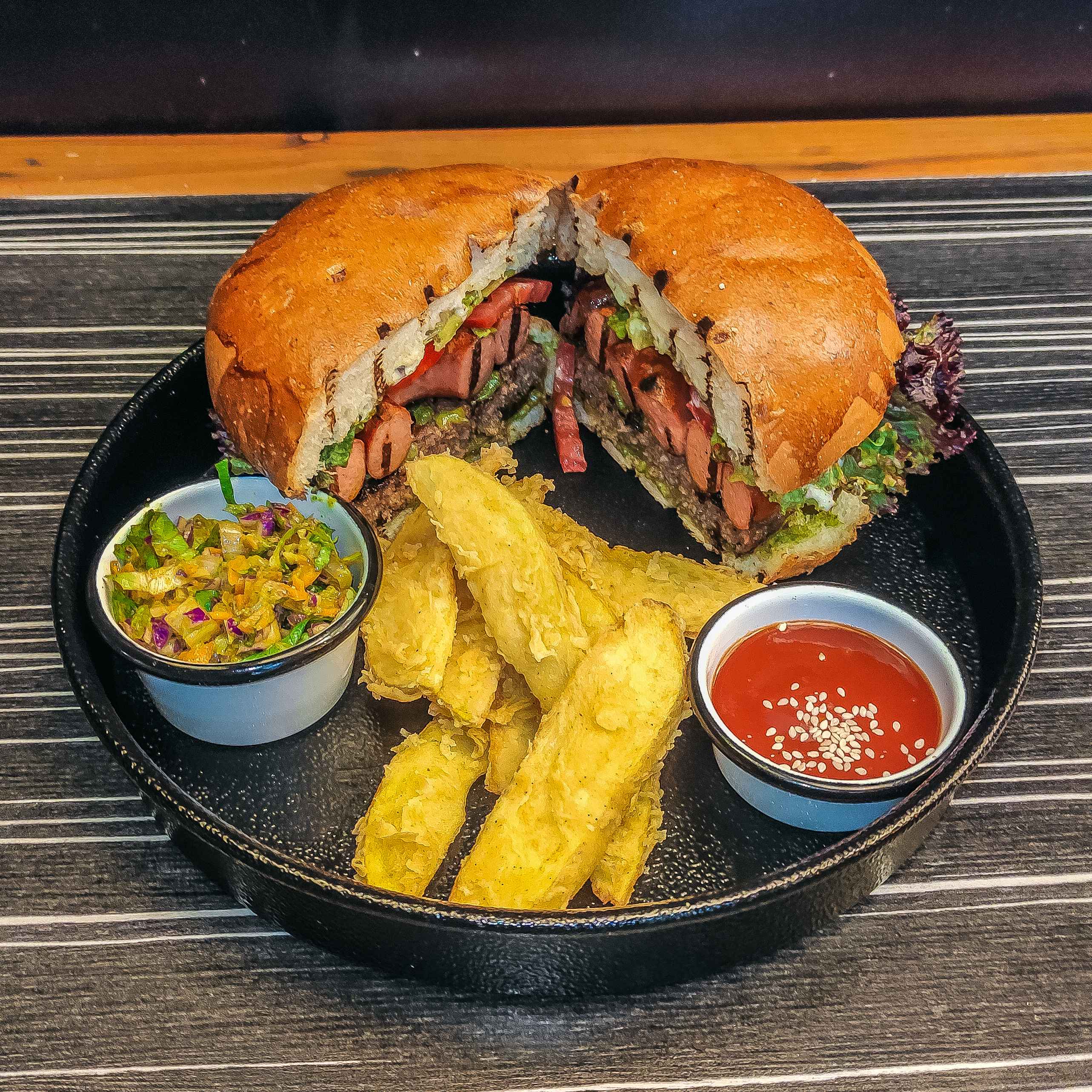 180 گرم گوشت گوساله _پیاز کاراملی _کاهو باتاویا _گوجهفرنگی _خیارشور_سس تربچه و پیازچه