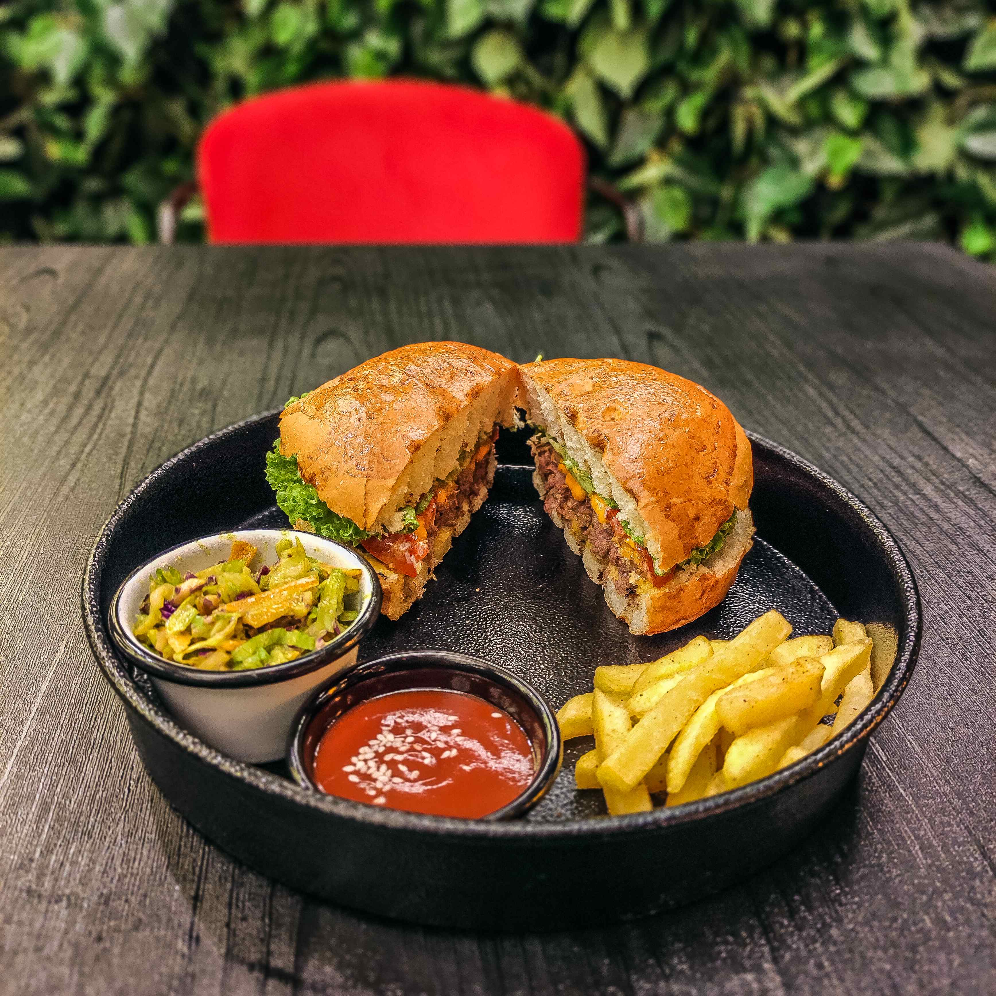 2 عدد گوشت گوساله 180 گرمی _پنیر چدار _کاهو باتاویا _گوجهفرنگی _خیارشور _سس رنج _سس سیگنیچر