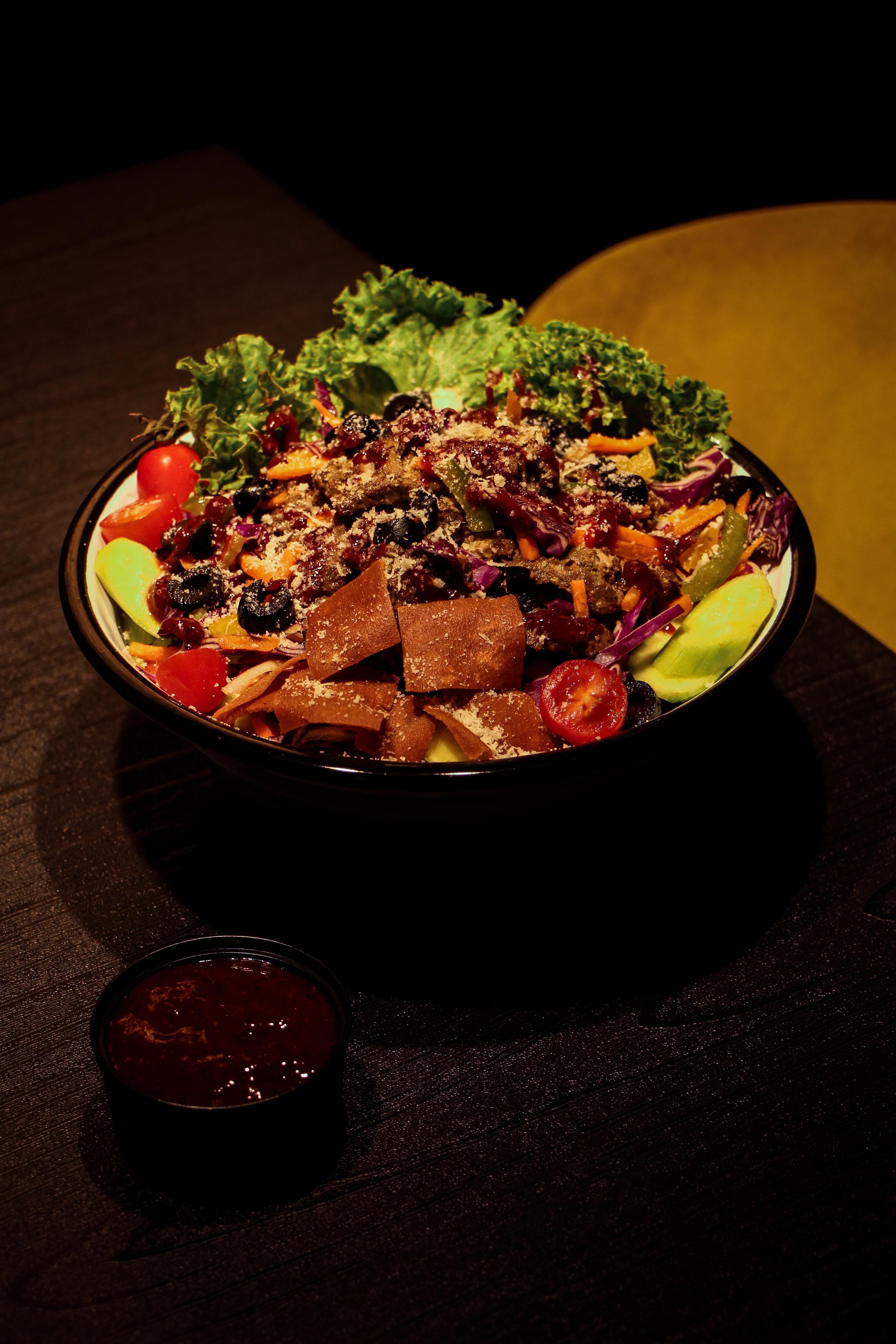 ترکیبی از کاهوهای فصل _فیله استیک مزهدار شده _زیتون _فلفل دلمه _پرتقال _سس کرنبری